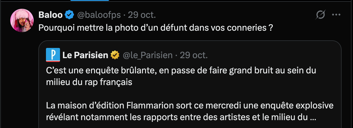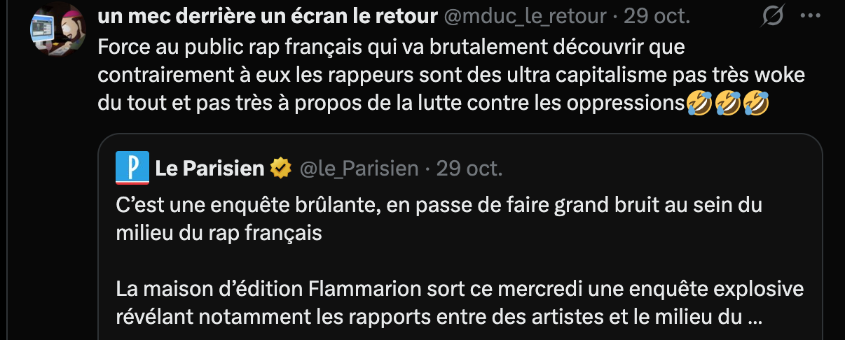 Depuis la parution de l’ouvrage, les médias généralistes se sont empressés de faire réagir certains acteurs du rap francophone comme Soprano dans le Parisien, ou encore Frank Gastambide toujours dans le même média, les principaux concernés eux ne semblent pas s’être attardés dessus. À contrario, c’est une nouvelle fois sur X que les réactions des passionné.es de rap semblent se faire les plus véhémentes et claires.